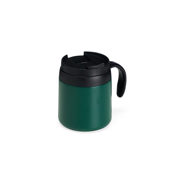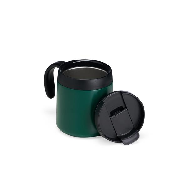 Caneca térmica feita em inox 304 com parede dupla, capacidade de 350 ml. Contém tampa de encaixe com acesso para o bocal, alça plástica e base antiderrapante.
